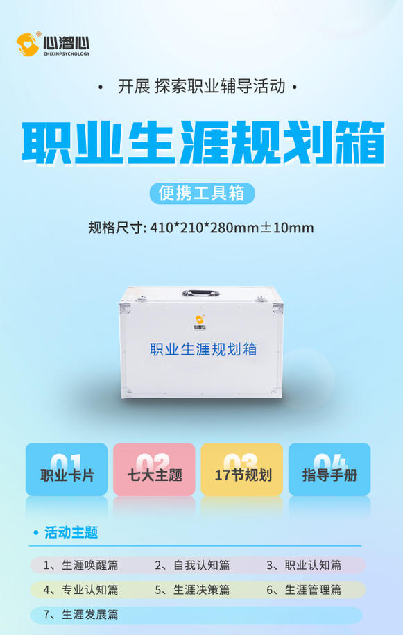 职业生涯规划箱内配置了包括开展和探索职业辅导活动所需的指导书及生涯卡片。整套设备设计合理制作精良,是学校心理咨询辅导及心理健康教育工作机构必备的心理辅导器材之一。