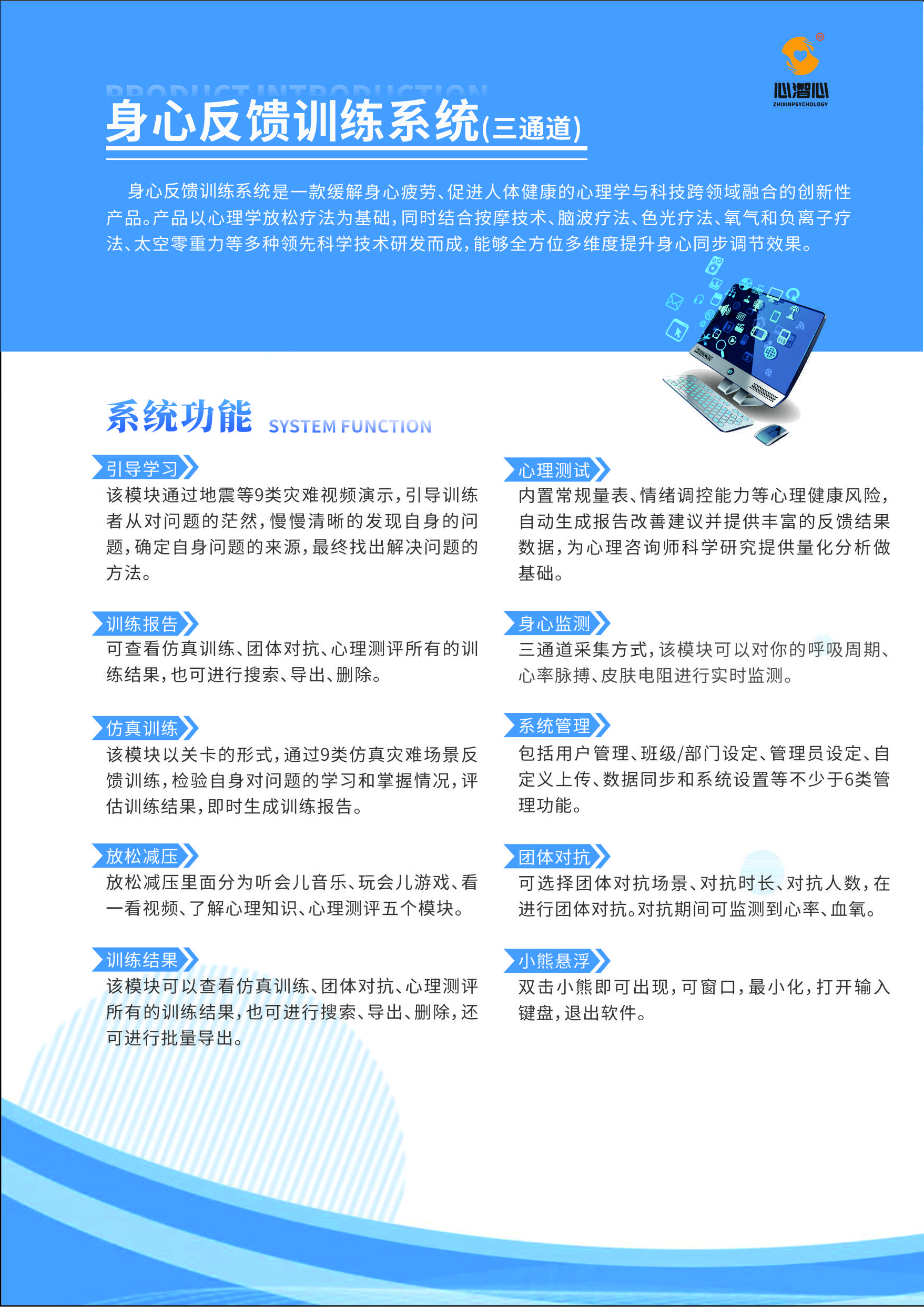 八大功能模块:包括引导学习、仿真训练、放松减压、团体对抗、身心监测、训练结果、设备管理、系统设置八大模块。