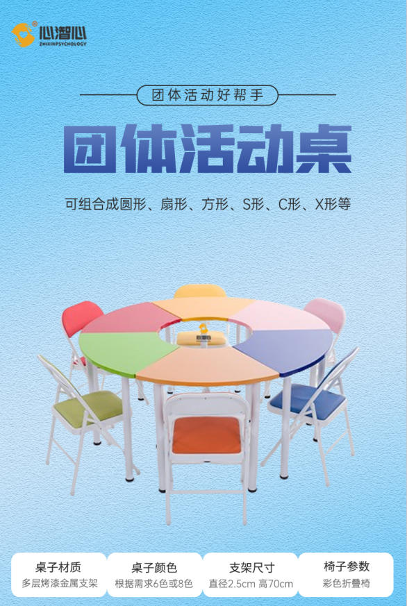 团体活动桌椅根据团体活动需要,组合成圆形、扇形、方形、S形、C形、X形等十几种组合方式,每套适合8人开展团体活动。是团体活动室器材之一,可以根据活动需要组合成多种方式。