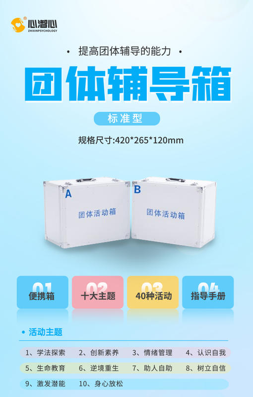 团体活动箱是帮助心理咨询师把握团体辅导的脉络、提高团体辅导的能力,解决更多团体、更多种类的心理困惑,同时让团体的每个人获得更深入、更持久的成长!
