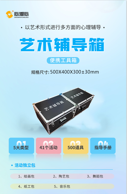 艺术辅导箱是以音乐、美术、舞蹈、书法等艺术形式,通过个体或团体活动进行多方面的心理辅导。包括绘画包、陶艺包、舞蹈包、纸工包和音乐包,共两个团体箱。