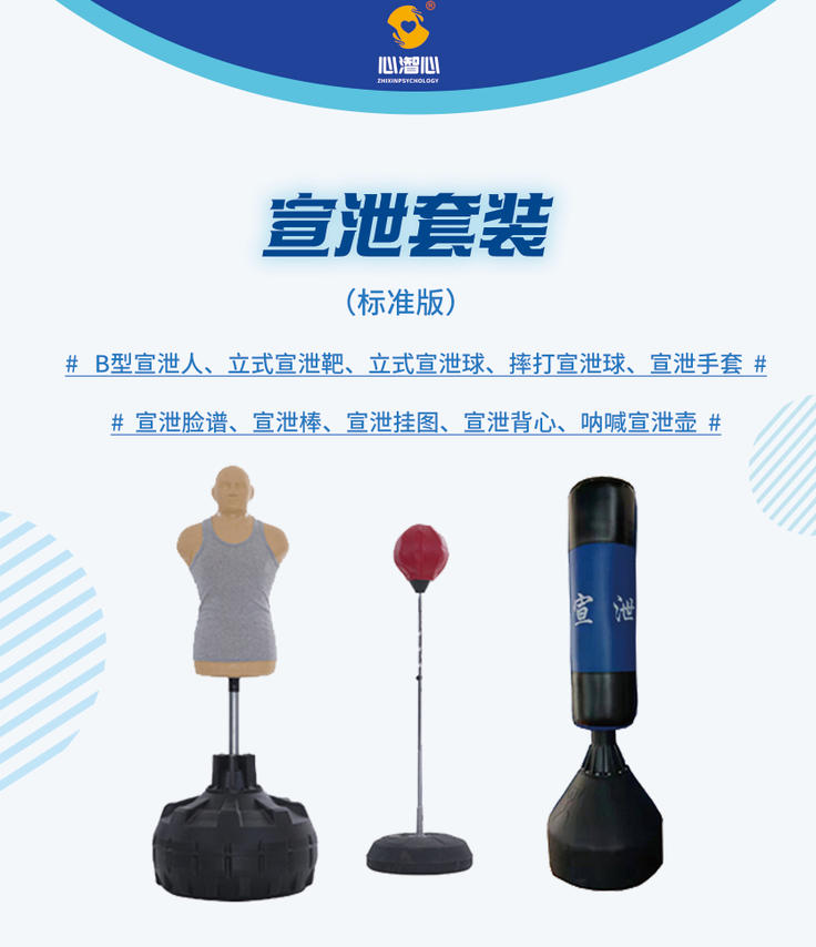宣泄套装(标准版)适合12—15平米的宣泄室,包含多种功能的宣泄器材,满足2-3人同时宣泄的需求。多种宣泄方式,使宣泄更具趣味性引导人们有针对性的发泄情绪