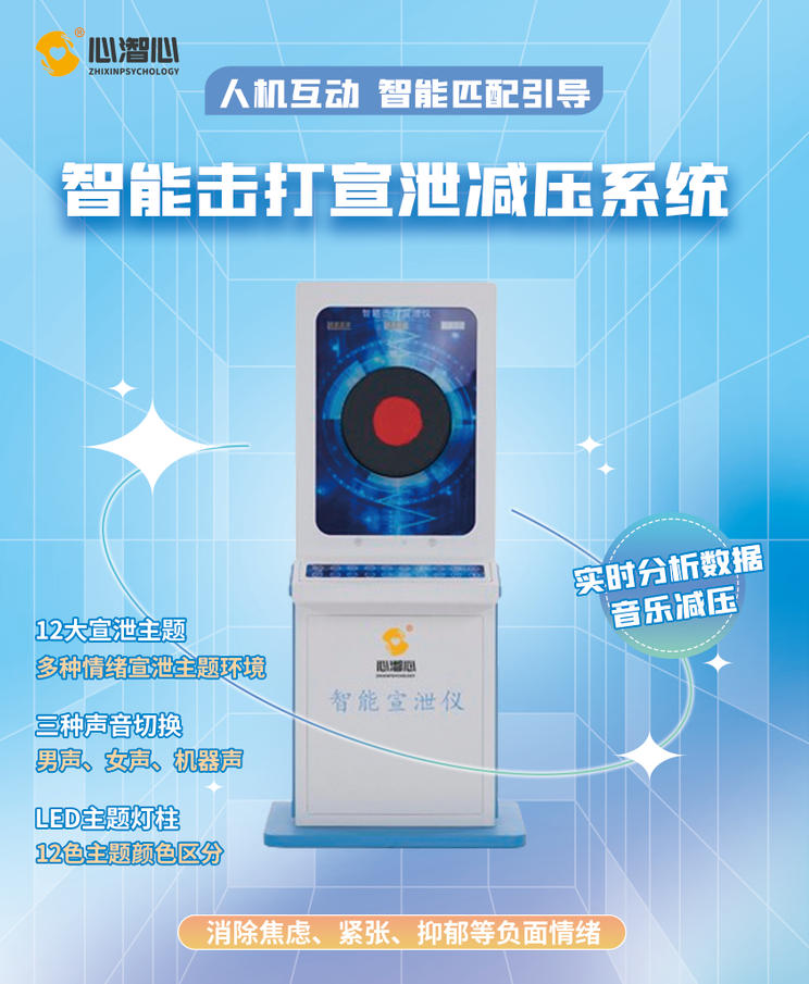 是一款结合击打宣泄、身心训练的宣泄设备。通过采集训练者击打力度、以及持续时间智能匹配互动指导语音,以新颖人机互动的方式完成情绪调节,消除焦虑、紧张、冲动、抑郁等负面情绪,达到调节身心、减缓压力、疏解情绪的宣泄效果。