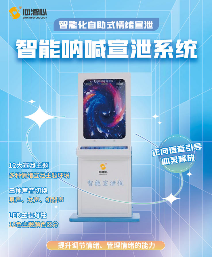 以呐喊为主题的新型智能化、自助式情绪宣泄设备。不需要咨询师引导,来访者可以选择最适合当前情绪的宣泄主题,自主、自助式来发泄其焦虑、紧张、自卑等负面情绪,同时在正向引导语的疏导下提升自己调节情绪、管理情绪的能力。